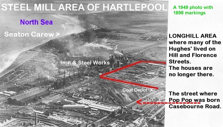 This area was in West Hartlepool when the Hughes Family lived there at the end of the 1800's and early 1900's. My great grandfather, John George Hughes, coal dealer, probably did his daily business at the coal depot marked on the map. My great great grandfather, George Henry Hughes, a puddler, worked in the Iron & Steel Mills adjacent to Longhill where he lived. Later, George Henry Hughes owned a Grocery and Provisions store on Florence Street in the Longhill section.