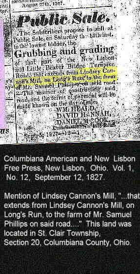 Cannon, Lindsey. Columbiana American & New Lisbon Free Press article regarding Lindsey Cannon's property in St. Clair Township, Columbiana County, Ohio--Volume 1 No 12, September 12, 1827.