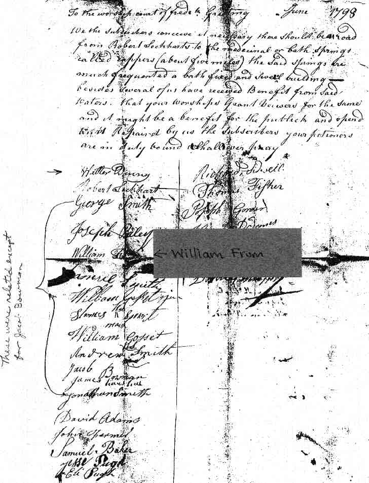 Frum, William. Signature on a 1798 Frederick County, Virginia document asking for a road to be constructed.