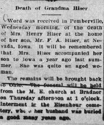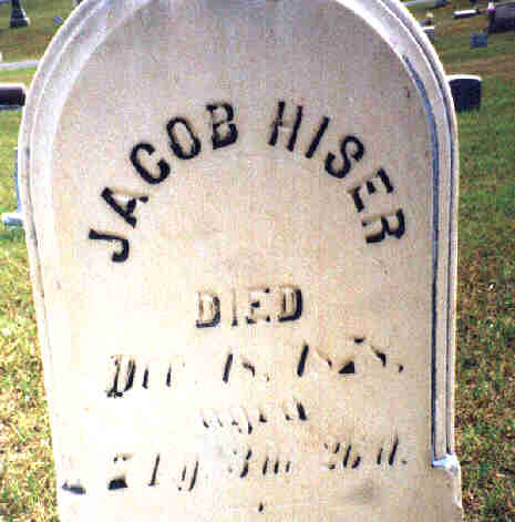 Hiser, Jacob. Son of George and Christina Filbs Hiser. Tombstone located in Woodville Cemetery, Sandusky County, Woodville, Ohio