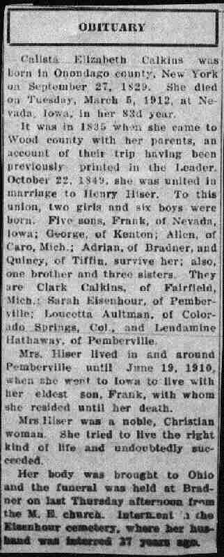 Calkins, Calista Elizabeth. Also see Calista Hiser.