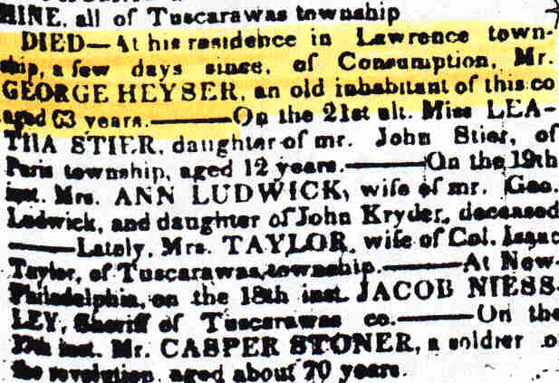 Hiser, George. Copy of death notice from "The Ohio Repository," Issue 1, March 1833, page 3, column 1.