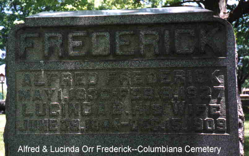 Frederick tombstone. Alfred and Lucinda Orr Frederick, Columbiana Cemetery, Columbiana County, Ohio.