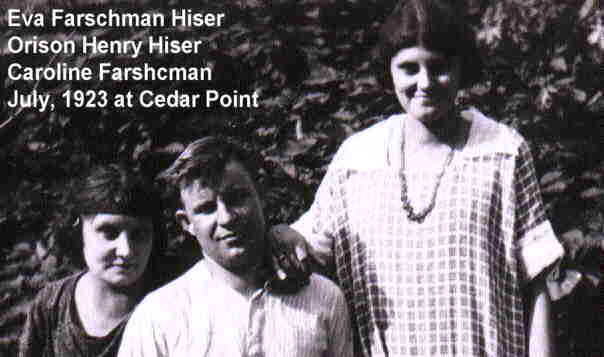 Hiser. Photograph of Orison Henry Hiser, Eva Farschman Hiser, and Caroline (Carrie) Hiser taken at Cedar Point, Ohio, July, 1923.