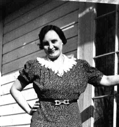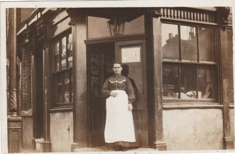 Hughes, Mary Ann Storey. Mother of John George Hughes. Photograph taken in front of their grocery store, 70 Florence Street, Longhill, West Hartlepool, England.