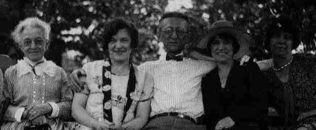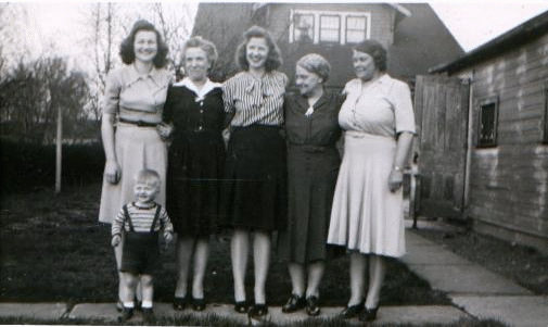 Kroll, Harriet. Group photograph. Little boy is Stacey Rocher standing in front of his mother, Min Rocher, to the left is Peg Rocher, Francis, Harriet Kroll, and unknown friend.