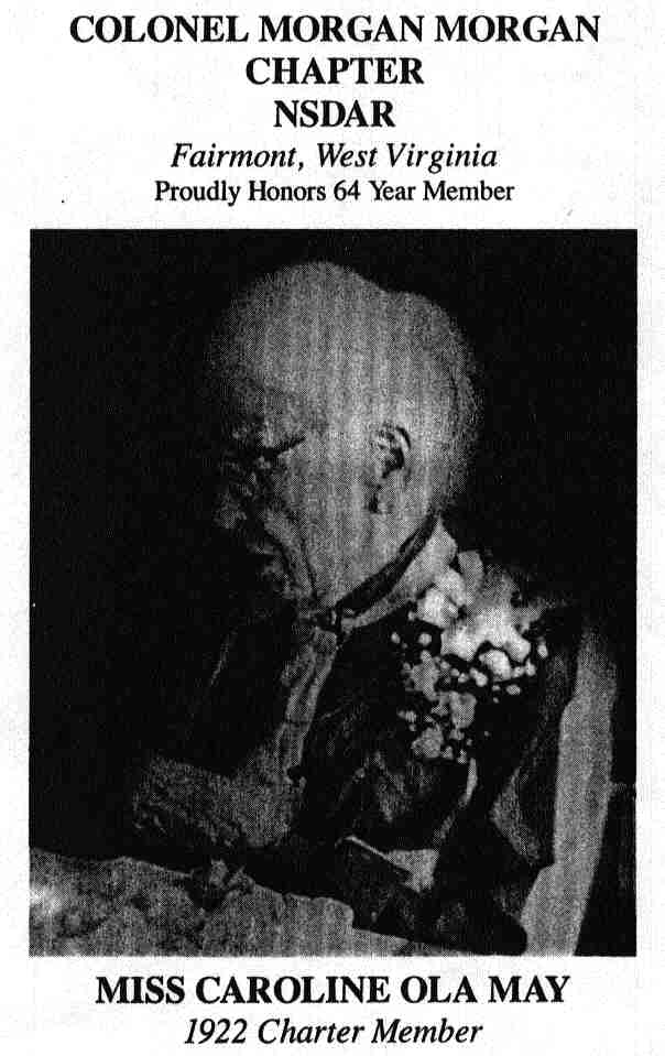 Sylvanus May born February 27, 1849 died March 20, 1927 married Louise A. Sigler. Their children were: (1) Dessie Lee May born December 16, 1878 died 1968 married Frank Reaser. (2) Caroline Ola May born September 4, 1880 died on October 16, 1990. (3) Eddie E. May born October 6, 1882 died August 1930. (4) Wilbur Morgan May born November 10, 1884 married Leah Mae DuBoise and had Francis Pierpont May born September 4, 1913 who married Helen Edward. (5) Clyde Arteville May born April 24, 1887 married Frances Cody Pocana. (6) George Amos May born June 18, 1889 married on June 13, 1918 Retta Smith. Their children were: Marie Ellen May born May 10 and married Maynard Webberly and lived in Milford, Ohio; George Willis May born September 19, an attorney who married Joanne Jenkins; Paul Edward May born December 28 and married Rutia Hall; Mildred Irene May born November 29, 1928 who married Edgar Heiskel; and Nan Elizabeth May born April 5 and lived in Fairfax, Virginia. (7) James Okey May born March 7, 1892 and married Alice Grimm and Odie McMillian. (8) Lawrence Pierpont May born December 4, 1893 died November 12, 1968 married Lucy Reaser and had one child, Estaline May born November 5, 1935 who married Howart Charlton. (9) Lora Eva May born August 14, 1895 married Joseph Stretchberry. (10) Loyd May. (11) Anna May born April 1898 died May 1898.