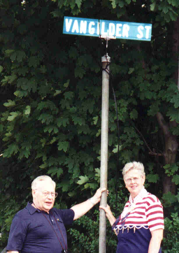 George VanGilder Hughes and Faith Hughes Roolf at the intersection of VanGiler and George Streets in Morgantown, West Virginia. The sign marks the area where John O. VanGilder's farm was located and the George Street honors George Ethelbert VanGilder, grandfather of George and Faith.