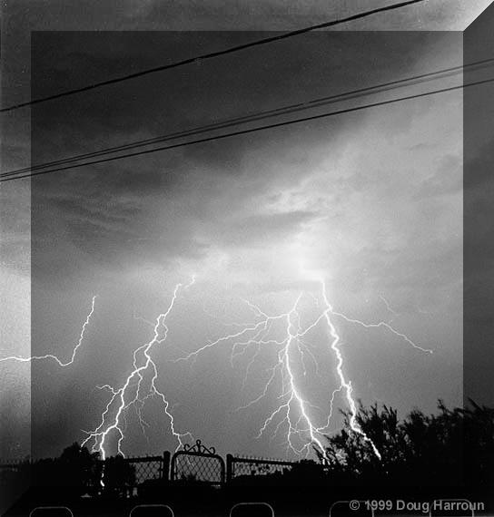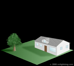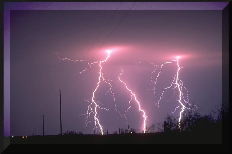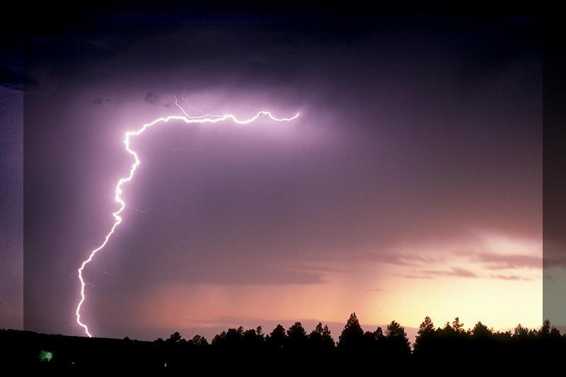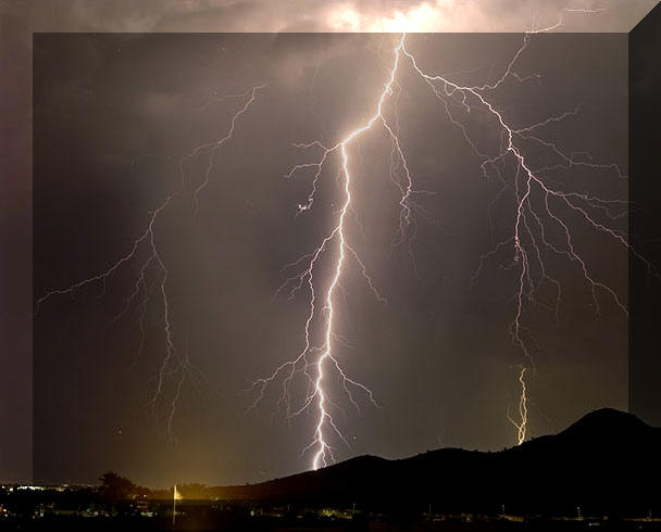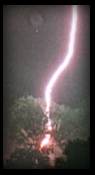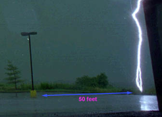 Se puede ver claramente el rayo cayendo a 15 mts de un alto poste metálico de iluminación, el fotografo comenta que a 45 mts hay un edificio de oficinas. El rayo no siempre cae en el objeto más alto o mejor conductor. Los rayos caen en los objetos más altos de un área particular. Por ejemplo, si hay un pequeño árbol solitario en un terreno amplio que a la vez está rodeado por árboles muy altos, el pequeño árbol está igualmente expuesto a recibir un rayo que los altos. Inclusive el suelo entre ellos se encuentra expuesto a los rayos. Si Ud. está afuera en un campo rodeado por objetos altos, no asuma que está protegido de los rayos.
