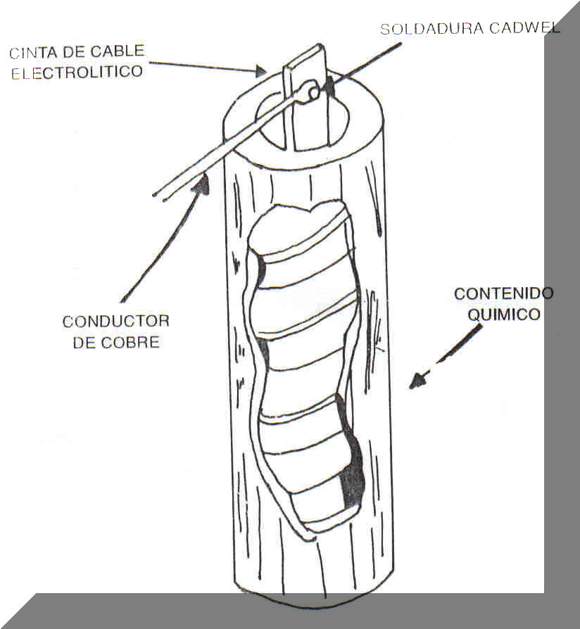 Electrodo a base de varilla Coperweld acompañada de carbón, sal, sulfato, rebaba de cobre, etc. |