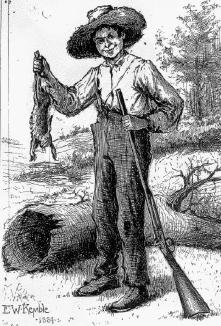 | Huck never tells us what he looks like, and seldom describes other people in much detail. Edward W. Kemble , the illustrator of the first edition of "The adventures of Huckleberry Finn" could only afford to pay one model to pose for all the characters in the novel. His various images of men and women, whites and blacks, "quality" folk and "loafers" were thus largely drawn from his own ideas of what these different kinds of human beings should look like. | ||||||||||