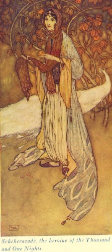 | Thousand and One nights or Arabian Nights is a series of anonymous stories in Arabic, considered as an entity to be among the classics of world literature. Desperately trying to avoid execution by her husband, the Sultan, Scheherezade hits upon the ingenious scheme of starting a suspenseful story each night, leaving the conclusion for the following evening. The sultan is spellbound by these cliffhangers. By the time a 1001 nights and stories have gone by, the sultan is ready to spare Scheherezade's life. The best known of these stories are those of Ali Baba, Sinbad the Sailor, and Aladdin. Although many of the stories are set in India, their origins are unknown and have been the subject of intensive scholarly investigation. The present form of Thousand and One Nights is thought to be native to Persia or one of the Arabic-speaking countries, but includes stories from a number of different countries and no doubt reflects diverse source material. A Scheherezade is a spinner of tales, one who holds people enthralled with stories. Illustrator Edmund Dulac. |