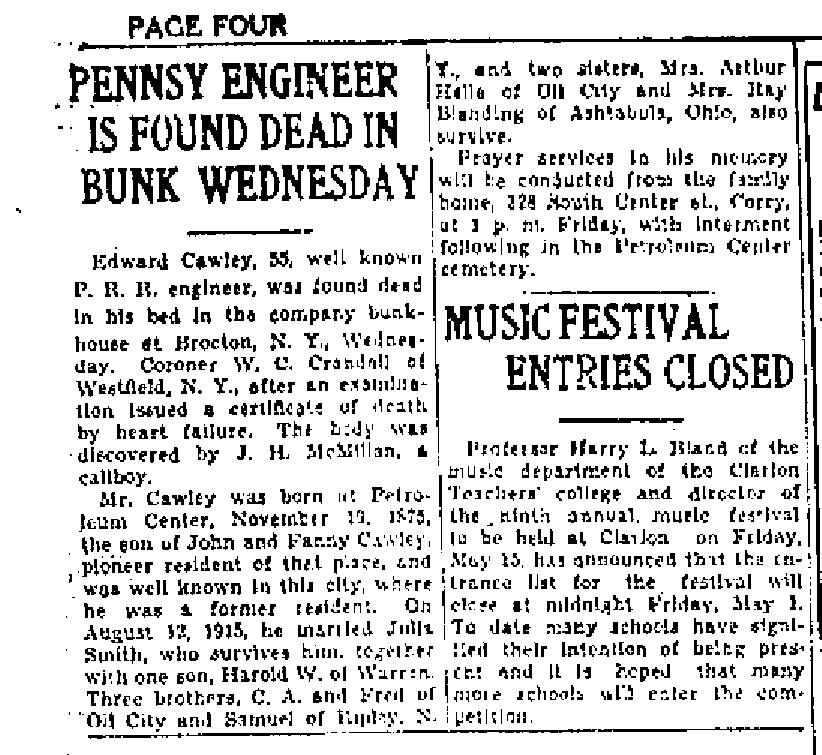 Cawley, Edward aged 55; Pennsylvania Railroad Engineer of Corry,former resident of Oil City,was found dead in his bed at the company bunkhouse in Brocton,NY on Wednesday April 29th, from a heart attack. Born in Petroleum Center on November 19,1875, son of John and Fannie Cawley. Married August 12,1915, Juliet E. Smith.(*note this obit said "Julia") She survives along with one son Harold W. of Warren. Also leaves brothers and sisters.