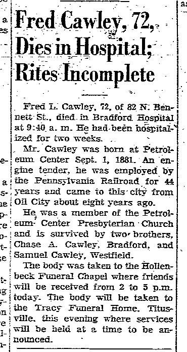 He was born September 1,1881,in Petroleum Center,the son of Mr. and Mrs. John H. Cawley of Petroleum Center.Surviving are two brothers,Sam Cawley of Westfield N.Y. and Charles (this should be Chase) Cawley of Bradford.The body is at the Tracy Funeral Home in Titusville.Plans for the funeral will be announced.