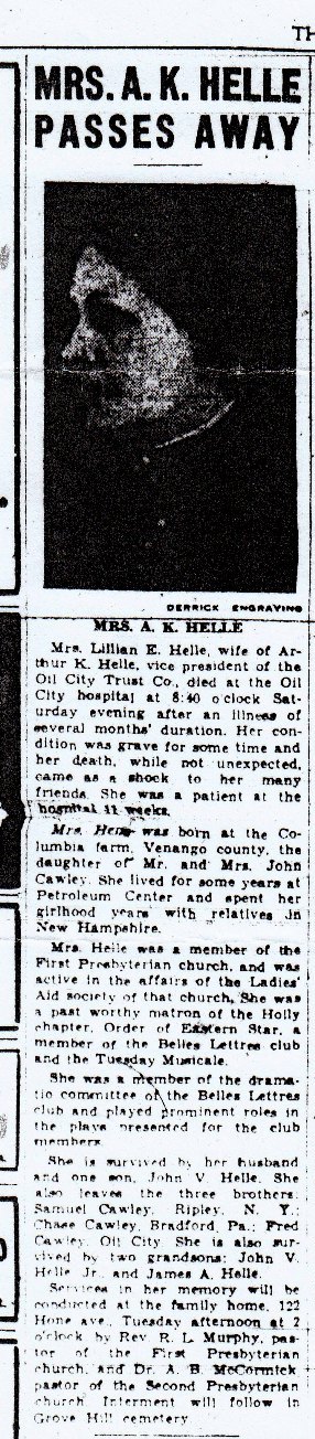 Mrs. Lillian E. Helle,wife of Athur K. Helle,vice president of the Oil City Trust Company, died at the Oil City Hospital at 8.40 o'clock Saturday evening after an illness of several months duration. Her condition was grave for some time and her death, while not unexpected,came as a shock to her many friends.She was a patient at the hospital for 11 weeks.Mrs.Helle was born at the Columbia Farm, Venango Cty, the daughter of Mr. and Mrs. John Cawley.She lived for some years at Petroleum Center and spent her girlhood years with relatives in New Hampshire. Mrs. Helle was a member of the First Presbyterian Church and was active in the affairs of the Ladies Aid Societyof that church.She was past Worthy Matron of the Eastern Star, a member of Belles Lettres Club and played prominent roles in the plays presented for club members.She was also a member of the Tuesday Musicale. She is survived by her husband and one son,John Vernon Helle.She also leaves three brothers,Samuel Cawley,Ripley,NY; Chase Cawley,Bradford,NY; Fred Cawley,Oil City. Interment will be at the Grove Hill Cemetery.