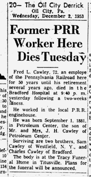 Fred L. Cawley,an employee of the Pennsylvania Railroad here for 50 years until his retirement several years ago,died in the Bradford Hospital following a two weeks illness. He worked in the local PRR enginehouse.