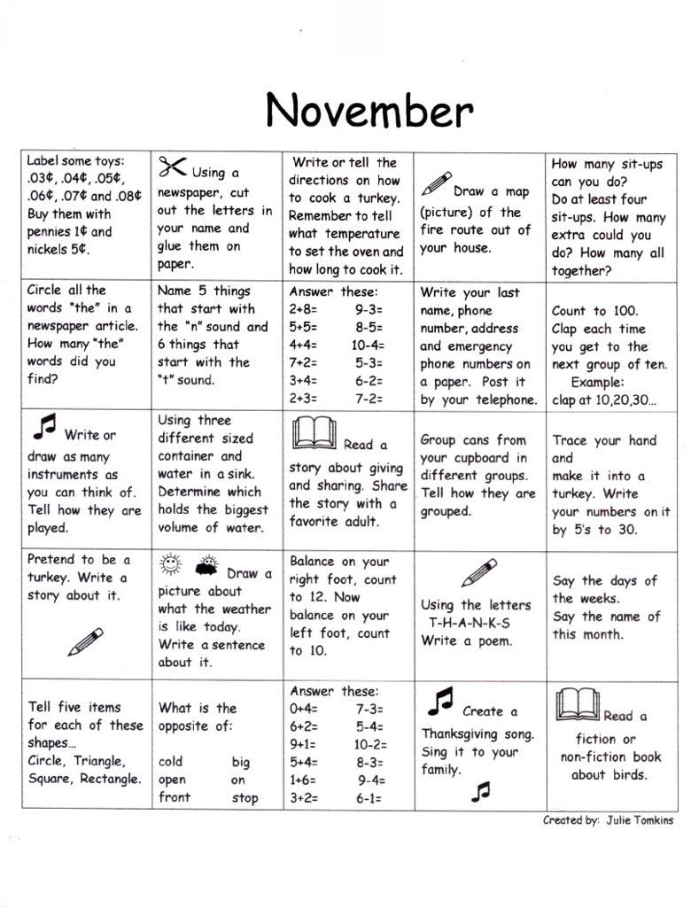 First Grade Activity Calendar - November