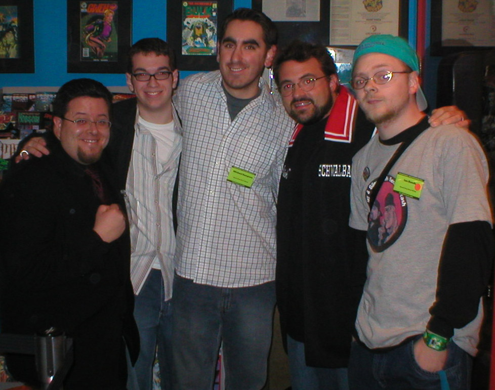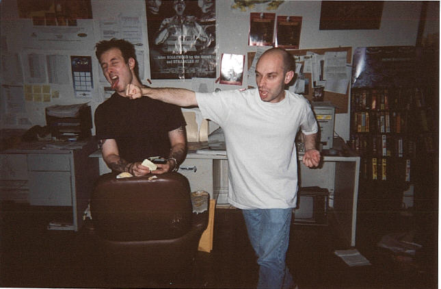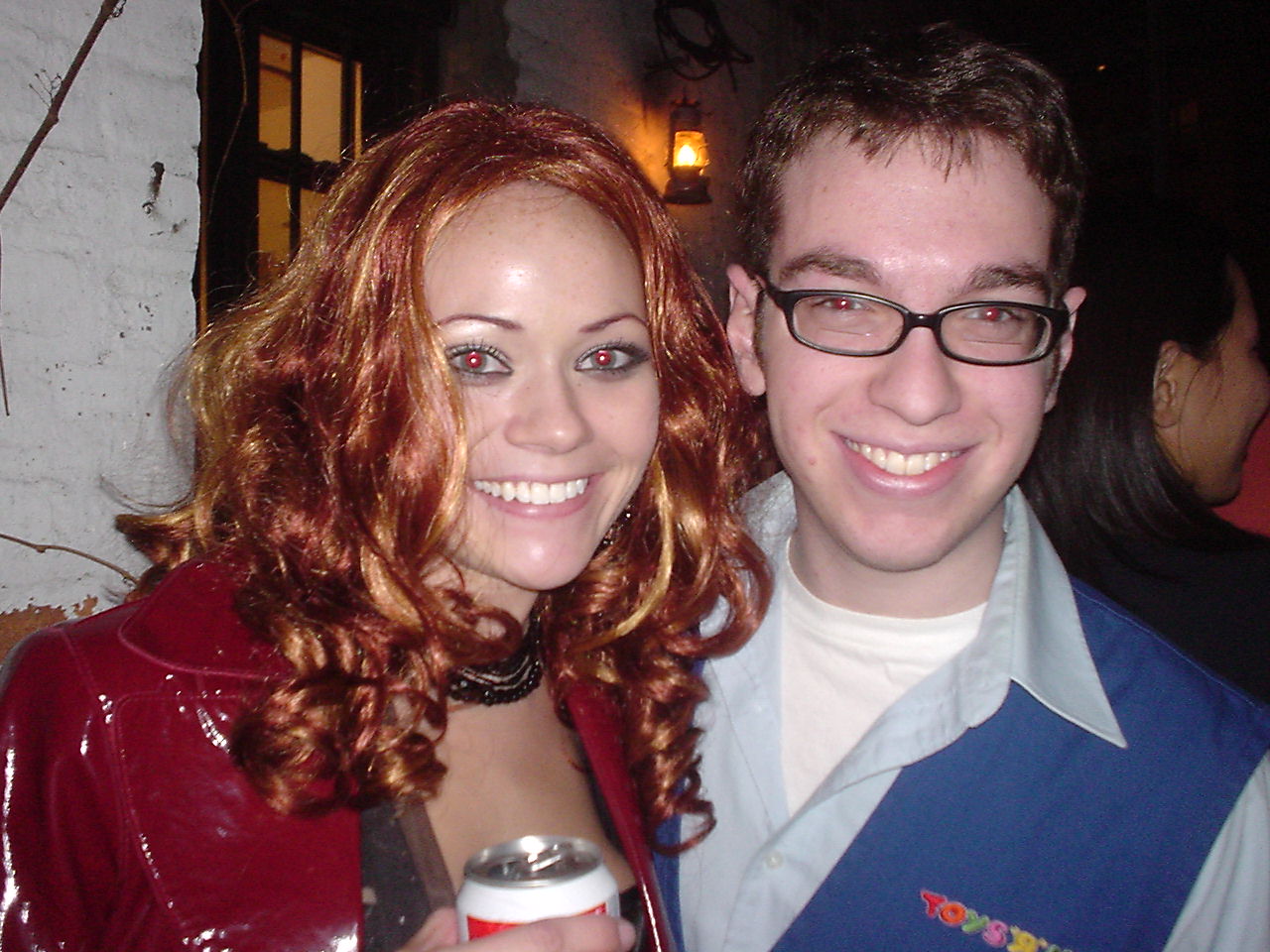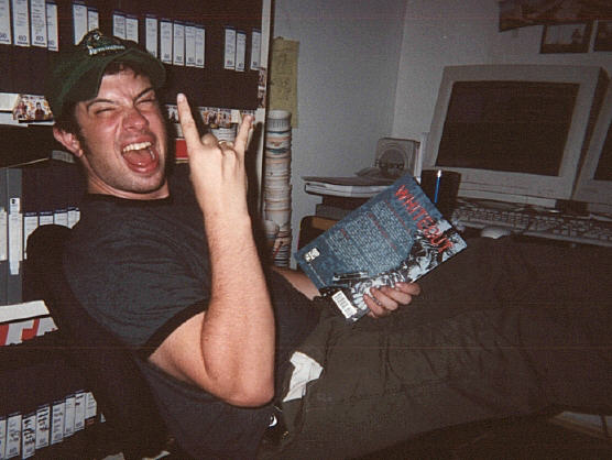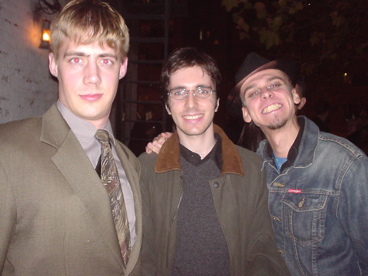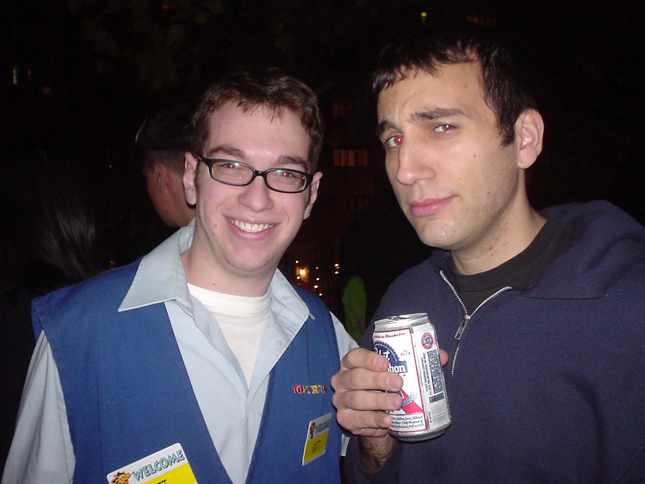 equals caring, or some crap like that... NEW! Happy Birthday Alberto! - This new batch is from Alberto's recent birthday party at Grassroots. Nice little group shot here. I'd tell you who's in it but from the time it took me to upload it to now I've totally forgotten who besides me is in it. NEW! Bullseye! - There's me and Mike Lyon playing darts - or rather, him playing and me making weird faces. I swear, I had no idea I was on camera there. NEW! Me Baby! ME! - Just in case you were wondering what I look likely lately here's a pretty good example. Good to see I'm really maturing into my 20s. NEW! Before...Pam's sharing the lens with me there. But she made an obnoxious comment about me so I was left with little choice... NEW! ...and After...I had to pop her. Matt & Robin: Styling - We got a whole bunch of Halloween 2K3 pictures. First up, dig me and Robin here. His facial expression kills me. He is way too cool for the room. Mike, Alberto, & Dan - Here's some NYU peeps: Mike, dressed as Gareth from 'The Office,' Alberto as "Sick Superman," and Dan as...um, Dan. Mike: Back on the Streets - There's Mike Lyon dressed as comic book gonzo journalist Spider Jerusalem, striking the classic "Back on the Streets" cover pose. If you know the character at all, that is an AMAZING shot (I took it, 'natch) of an AMAZING costume. Go-Go Goes Goes - Speaking of awesome costumes, dig on Minjae as Go-Go from the most excellent film Kill Bill. James So Pretty - James, who was NOT repeat NOT dressed like a pumpkin at his most photogenic. Maggie & Matt - Myself and the lovely Maggie, dressed as Satine (I probably spelled it wrong) from Moulin Rouge. I didn't get the costume - I never saw the entire movie - and I was honest that I didn't know what she was. Ho boy, was that ever a mistake. Smile Guys! There's Robin hiding behind Mike and Soren, whose expressions in this picture seem especially drunken and hilarious. The Poop Shoot Staff - Taken at Stash Bash 2, from left to right we have Antony Teofilo (Renaissance Man), yours truly, Mike Sampson (The Bottom of The Things), Arthur P. Huckledink (Smart are the Brave), and Ian Bonds (Game On!). Good looking bunch if you ask me. Poop Shoot & Jason Mewes - Another Stash Bash 2 shot with Jason "Jay" Mewes. His raised eyebrow kinda freaks me out there. Ming The Merciful - That's me and Ian with View Askew web master and graphic design guru Ming. We have him to thank for how cool my column looks, particularly that spiffy logo he designed. Let's all take a moment to reflect on his contributions to my work. No, I said one moment. Sigh, let's just move on. Bruce Campbell and Matt- Here at last, is the physical evidence of the meeting of two of the titans of the universe. Like Roosevelt and Churchill. Like Laurel and Hardy. It's Bruce and Matt! This was at the book signing in NYC. I must bronze this picture and preserve it always. Kevin So and Matt!- Kevin is an AMAZING folk singer/songwriter who I first heard at this year's Falcon Ridge Folk Festival. A chance encounter in Harvard Square led to an evening spent listening to him perform on the street for hours. It was incredible. I got the picture. Check out Kevin's website HERE. Matt & Poingly Take You High- Here's the finale of a recent performance. We're doing a rousing cover of Creed's Higher, so I, of course, had to take off my shirt to reveal a nasty wife beater. I guess you had to be there. Actually, you're probably lucky you weren't. Ambush At Big Apple Con- Don't ever try to give Stormtroopers phony credits for comics. I learned the hard way. Pray for a quick recovery for me. El Presidente- Here I am, as University Union President, in all my power, prestige and glory. Truly an awe inspiring figure. And, yes, that is my chair. There's A Party Going On- Here's an action shot from my pal Heather's suprise birthday party. I don't feel like listing everyone here, but obviously that's me and Pete in the foreground jamming on guitar. Freaky Deaky- Here's a quick snap done a week or so ago, check out the facial hair! Freaky deaky, indeed. Full Body Deaky- For some reason, the photog wanted a full body shot as well. This is my serious model face. Tiptoe Through The Tulips- I wish I had an explanation for this. Or a cute caption. I don't. I'm just very, very sorry. The Greatest Sight On Earth- Here's a picture of the finest place on earth I know. Okay I exaggerate, but only slightly. Just gorgeous. Matt And Tom's It only took me 6 years since the damn show ended, but I finally made my way up to 2880 Broadway at 112th, where the famous Tom's Restaurant stands. Truly, my life has reached its apex. The Troma Files: The Great Troma Building- Here it is, where all the magic happens. Unfortunately, they didn't let me work in that building. I wasn't pretty enough. So I worked in a third story walk up across the street. Not kidding either. The Troma Files: Ronni and Brian- Ronni, on the left, is the head of Troma Team Video. He took Brian's Subway sammich. Brian, on right, is the assistant editor at Troma. He was hungry. Playing with fire here folks. The Troma Files: SeanCo's CEO- This is Sean McGrath, assistant editor at Troma, my boss there, and the CEO and founder of the amazing SeanCo. Industries. A true visionary. The Troma Files: The Head Honcho- Gabe Friedman, head editor at Troma, and all around..er...guy. He's far more professional and talented than the picture denotes. But he does love that heavy metal music. The Taurus Of Love: Then- There it is in all its glory. The Steed. The Stallion. The mighty TAURUS OF LOVE! My car. What a beaut. The Taurus Of Love: Now- Thank goodness no one was hurt. That said, can I just whine; MY CAR!!! GAH!!! A Freshman is Born- Me on my first day in my frestman dorm room. Note the posters. Note the glasses. Note the jean shorts. Note the doughy-eyed optimism. Is that even how you spell doughy? Me and the Wad- That's me one of the first weekend's of junior year. That wad is all real money, fr