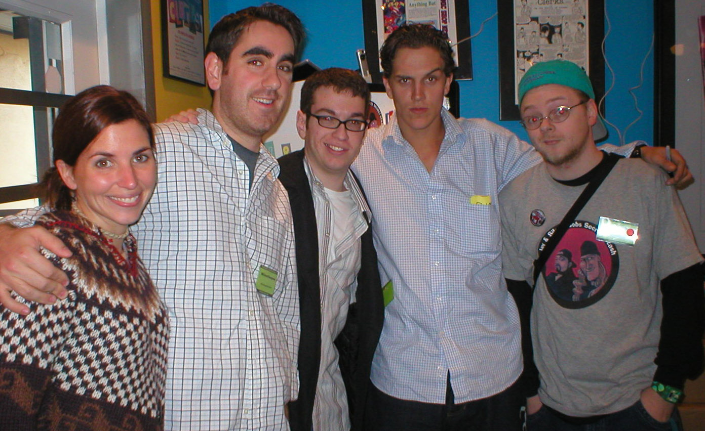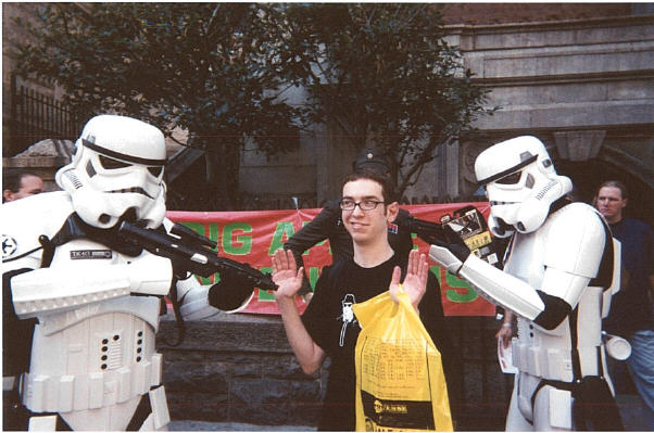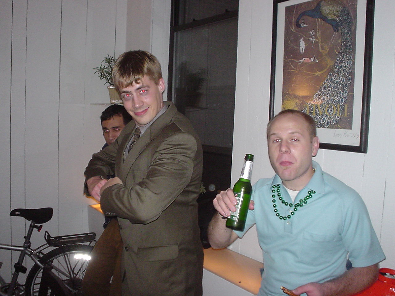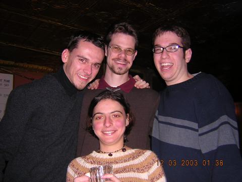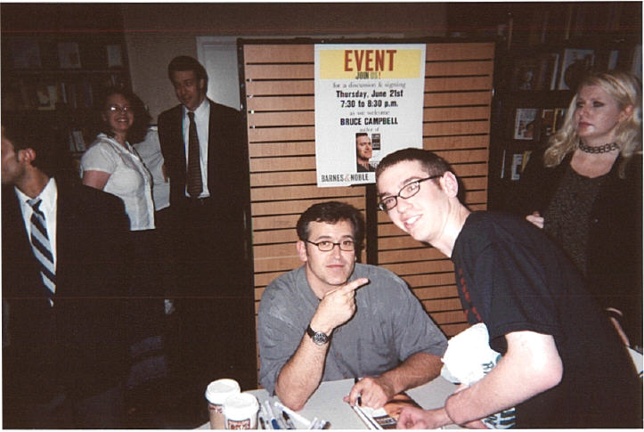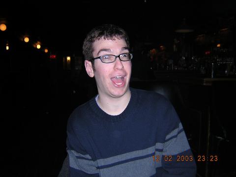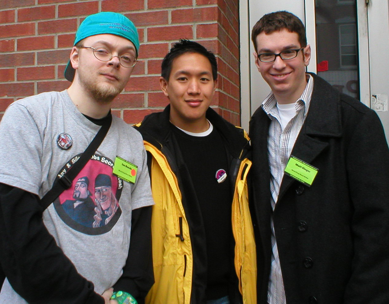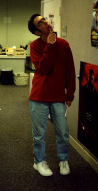 equals caring, or some crap like that... NEW! Happy Birthday Alberto! - This new batch is from Alberto's recent birthday party at Grassroots. Nice little group shot here. I'd tell you who's in it but from the time it took me to upload it to now I've totally forgotten who besides me is in it. NEW! Bullseye! - There's me and Mike Lyon playing darts - or rather, him playing and me making weird faces. I swear, I had no idea I was on camera there. NEW! Me Baby! ME! - Just in case you were wondering what I look likely lately here's a pretty good example. Good to see I'm really maturing into my 20s. NEW! Before...Pam's sharing the lens with me there. But she made an obnoxious comment about me so I was left with little choice... NEW! ...and After...I had to pop her. Matt & Robin: Styling - We got a whole bunch of Halloween 2K3 pictures. First up, dig me and Robin here. His facial expression kills me. He is way too cool for the room. Mike, Alberto, & Dan - Here's some NYU peeps: Mike, dressed as Gareth from 'The Office,' Alberto as "Sick Superman," and Dan as...um, Dan. Mike: Back on the Streets - There's Mike Lyon dressed as comic book gonzo journalist Spider Jerusalem, striking the classic "Back on the Streets" cover pose. If you know the character at all, that is an AMAZING shot (I took it, 'natch) of an AMAZING costume. Go-Go Goes Goes - Speaking of awesome costumes, dig on Minjae as Go-Go from the most excellent film Kill Bill. James So Pretty - James, who was NOT repeat NOT dressed like a pumpkin at his most photogenic. Maggie & Matt - Myself and the lovely Maggie, dressed as Satine (I probably spelled it wrong) from Moulin Rouge. I didn't get the costume - I never saw the entire movie - and I was honest that I didn't know what she was. Ho boy, was that ever a mistake. Smile Guys! There's Robin hiding behind Mike and Soren, whose expressions in this picture seem especially drunken and hilarious. The Poop Shoot Staff - Taken at Stash Bash 2, from left to right we have Antony Teofilo (Renaissance Man), yours truly, Mike Sampson (The Bottom of The Things), Arthur P. Huckledink (Smart are the Brave), and Ian Bonds (Game On!). Good looking bunch if you ask me. Poop Shoot & Jason Mewes - Another Stash Bash 2 shot with Jason "Jay" Mewes. His raised eyebrow kinda freaks me out there. Ming The Merciful - That's me and Ian with View Askew web master and graphic design guru Ming. We have him to thank for how cool my column looks, particularly that spiffy logo he designed. Let's all take a moment to reflect on his contributions to my work. No, I said one moment. Sigh, let's just move on. Bruce Campbell and Matt- Here at last, is the physical evidence of the meeting of two of the titans of the universe. Like Roosevelt and Churchill. Like Laurel and Hardy. It's Bruce and Matt! This was at the book signing in NYC. I must bronze this picture and preserve it always. Kevin So and Matt!- Kevin is an AMAZING folk singer/songwriter who I first heard at this year's Falcon Ridge Folk Festival. A chance encounter in Harvard Square led to an evening spent listening to him perform on the street for hours. It was incredible. I got the picture. Check out Kevin's website HERE. Matt & Poingly Take You High- Here's the finale of a recent performance. We're doing a rousing cover of Creed's Higher, so I, of course, had to take off my shirt to reveal a nasty wife beater. I guess you had to be there. Actually, you're probably lucky you weren't. Ambush At Big Apple Con- Don't ever try to give Stormtroopers phony credits for comics. I learned the hard way. Pray for a quick recovery for me. El Presidente- Here I am, as University Union President, in all my power, prestige and glory. Truly an awe inspiring figure. And, yes, that is my chair. There's A Party Going On- Here's an action shot from my pal Heather's suprise birthday party. I don't feel like listing everyone here, but obviously that's me and Pete in the foreground jamming on guitar. Freaky Deaky- Here's a quick snap done a week or so ago, check out the facial hair! Freaky deaky, indeed. Full Body Deaky- For some reason, the photog wanted a full body shot as well. This is my serious model face. Tiptoe Through The Tulips- I wish I had an explanation for this. Or a cute caption. I don't. I'm just very, very sorry. The Greatest Sight On Earth- Here's a picture of the finest place on earth I know. Okay I exaggerate, but only slightly. Just gorgeous. Matt And Tom's It only took me 6 years since the damn show ended, but I finally made my way up to 2880 Broadway at 112th, where the famous Tom's Restaurant stands. Truly, my life has reached its apex. The Troma Files: The Great Troma Building- Here it is, where all the magic happens. Unfortunately, they didn't let me work in that building. I wasn't pretty enough. So I worked in a third story walk up across the street. Not kidding either. The Troma Files: Ronni and Brian- Ronni, on the left, is the head of Troma Team Video. He took Brian's Subway sammich. Brian, on right, is the assistant editor at Troma. He was hungry. Playing with fire here folks. The Troma Files: SeanCo's CEO- This is Sean McGrath, assistant editor at Troma, my boss there, and the CEO and founder of the amazing SeanCo. Industries. A true visionary. The Troma Files: The Head Honcho- Gabe Friedman, head editor at Troma, and all around..er...guy. He's far more professional and talented than the picture denotes. But he does love that heavy metal music. The Taurus Of Love: Then- There it is in all its glory. The Steed. The Stallion. The mighty TAURUS OF LOVE! My car. What a beaut. The Taurus Of Love: Now- Thank goodness no one was hurt. That said, can I just whine; MY CAR!!! GAH!!! A Freshman is Born- Me on my first day in my frestman dorm room. Note the posters. Note the glasses. Note the jean shorts. Note the doughy-eyed optimism. Is that even how you spell doughy? Me and the Wad- That's me one of the first weekend's of junior year. That wad is all real money, fr