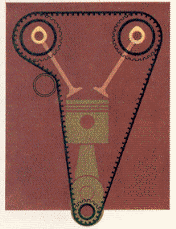 | Actualmente no se usa mucho, generalmente se realiza por medio un tren de engranajes helicoidales para disminuir ruidos, tiene como desventaja el peso, el ruido pero asegura una perfecta distribuci�n siempre y cuando se tenga el mantenimiento respectivo de los engranajes y sus ajustes. | ||||||||||||||||||||||||||||||||||||||||