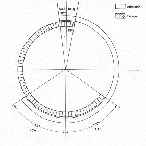 | En la distribuci�n real se presentan diferentes comportamientos para que el funcionamiento de la distribuci�n sea �ptimo. Esto se ve ya que la v�lvula de admisi�n abre entes de que el pist�n llegue al PMS en su carrera de escape del ciclo anterior, lo cual se conoce como Anticipo en la Apertura de Admisi�n (AAA). Cuando el pist�n llega al PMI la v�lvula sigue abierta por un tiempo para que el llenado sea completo y se conoce el Retraso en el Cierre de Admisi�n (RCA). En este caso el tiempo de compresi�n varia por que �ste se inicia aun con la v�lvula de admisi�n abierta. Cando el pist�n est� en su carrera descendente debido a la combusti�n, la v�lvula de escape se abre antes de que termine el recorrido, lo que se conoce como Anticipo en Apertura de Escape (AAE) y para que los gases quemados salgan totalmente del cilindro la v�lvula se deja abierta despu�s de que el pist�n llega al PMS nuevamente este tiempo se indica como Retraso en el Cierre de Escape (RCE). La entrada de una mezcla nueva tambi�n ayuda a que los gases salgan mas r�pido del cilindro y permite refrigeraci�n de la cabeza del pist�n. |