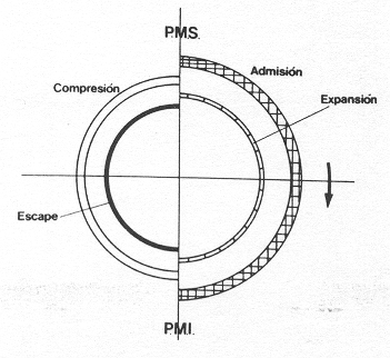 | El esquema de la distribuci�n te�rica muestra el comportamiento como si la mezcla entrara instant�neamente cuando el pist�n llega al PMS, mientras que la v�lvula abre de igual forma, luego cuando el pist�n llega al PMI se cierra tambi�n instant�neamente, el pist�n sube y baja nuevamente para realizar la compresi�n y la expansi�n y cuando llega el tiempo de escape sucede lo mismo, movimientos instant�neos. | ||||||||||||||||||||||||||||||||||||||||