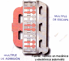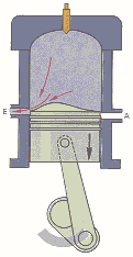 | 2. V�LVULAS Las v�lvulas est�n dotadas de un movimiento alternativo y se abren hacia el interior de la c�mara de combusti�n, de manera que la estanquidad se ve favorecida por la presi�n de los gases. En el caso de los motores de dos tiempos, la funci�n de la v�lvula es cumplida por el mismo pist�n, es decir �ste es el que se encarga de permitir el flujo desde la lumbreras hacia la c�mara de compresi�n. En el esquema que se muestra se ve que las lumbreras A y E, de admisi�n y escape respectivamente, est�n gobernadas por el movimiento alternativo del pist�n. Este tipo de funcionamiento se presenta tambi�n en algunos motores Diesel de muy bajas revoluciones. |
