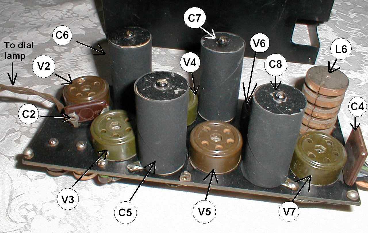 | The underside of the RF Amplifier circuit board. The main features are numerous coils on bakelite or wood spools and 4 capacitors and a resistor. The paper capacitors (C9 and C10) have been hollowed out with a drill, and modern metalized polypropylene replacements have been inserted inside them. This repair is virtually invisible. The two picofarad value capacitors (C1, C3) are more durable than their paper companions, and are original. The resistance of the single resistor (R1) should be checked with an ohmmeter, this can be done without removing it from the circuit board. Its value should be 2800 ohms. The value of this resistor seems particularly prone to drift with age. Coil L8 is also prone to failure. Measure the resistance between its two ends to ensure continuity. | ||||||||||||||