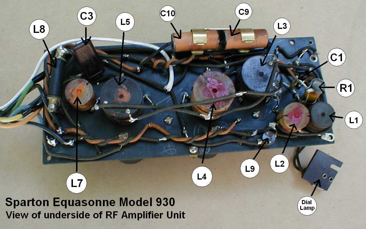 | The RF amplifier of the Sparton Equasonne is contained in a black metal box located in front of the power converter and beside the selector unit. It houses six 484 or 485 tubes. Five of the six tubes serve as low gain amplifiers for the radio signal, while the final tube serves as the detector. The Equasonne differs from more 'conventional' TRF radios, in that the 5 stages of amplification used are 'un-tuned'. All tuning is performed beforehand by 4 ganged tuned circuits inside the selector unit. Of the 3 modules of which this radio is comprised, the RF Amplifier will most likely require the most effort to restore. The RF Amplifier of most Sparton Equasonne models appear to be very similar. However that of the 930 does differ slightly from the more common type found in the 301, 589, 931 etc. |