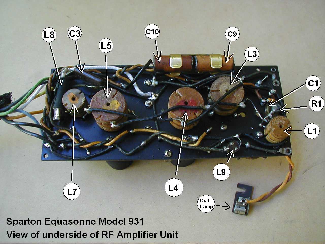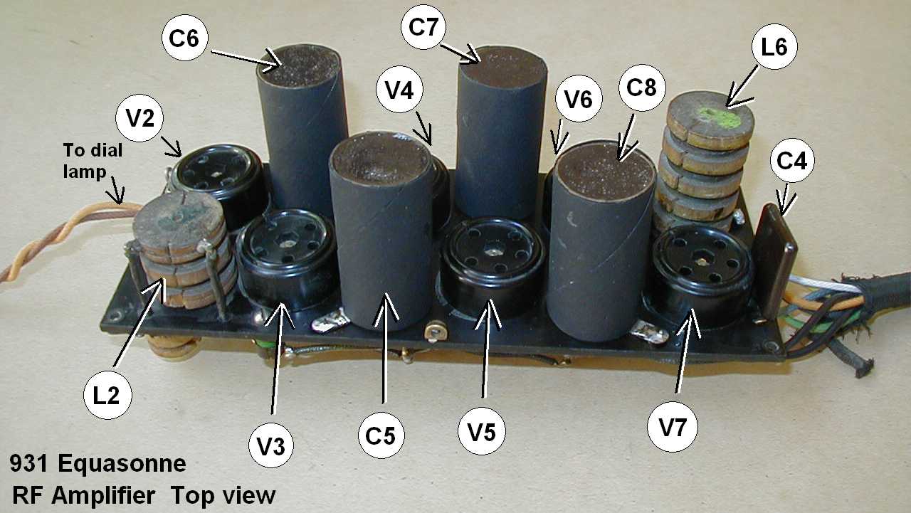 | The RF amplifier of the Sparton Equasonne is contained in a black metal box located in front of the power converter and beside the selector unit. It houses six 484 or 485 tubes. Five of the six tubes serve as low gain amplifiers for the radio signal, while the final tube serves as the detector. The Equasonne differs from more 'conventional' TRF radios, in that the 5 stages of amplification used are 'un-tuned'. All tuning is performed beforehand by 4 ganged tuned circuits inside the selector unit. Of the 3 modules of which this radio is comprised, the RF Amplifier will most likely require the most effort to restore. The RF Amplifier of most Sparton Equasonne models appear to be very similar. Models 103, 111A, 235, 301, 301A, 564, 570, 578, 589, 600, 610, 620, 737, 740, 750, 870 and 931 have identical amplifiers. Models 930 and 89A have a slightly different RF Amp. circuit, but is interchangable/compatible with other Models. |