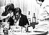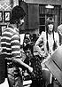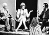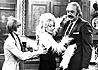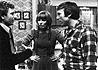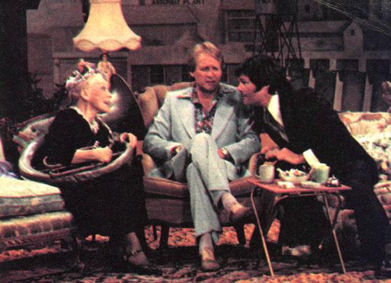 | Greg Mullavey and Louise Lasser with a crew member between taping |