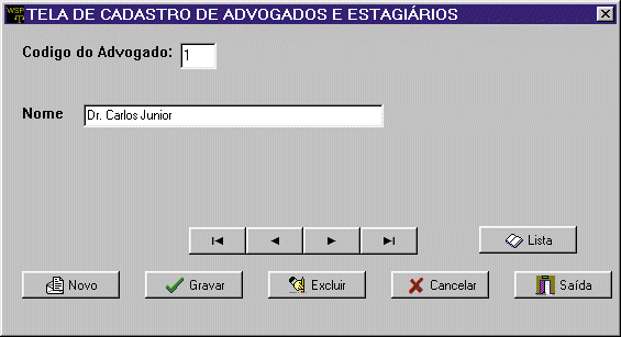 Nesta tela você cadastra os advogados que vão tratar dos seus processos. Assim você poderá imprimir os processos do advogado ou estagiário X.