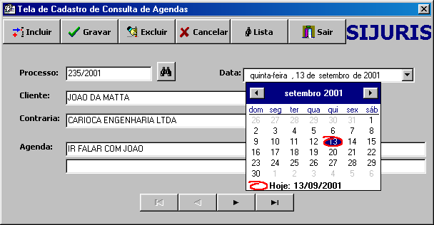 Nesta tela você cadastra as suas agendas. O que você cadastra aqui poderá imprimir depois escolhendo o dia da agenda.