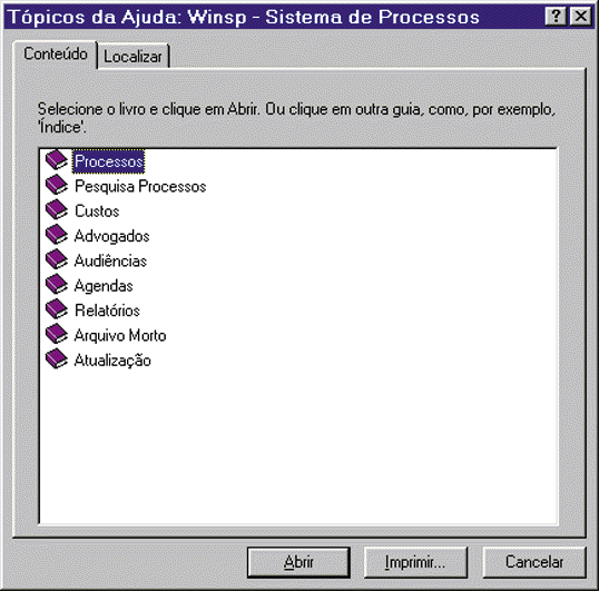 Aqui você tem uma ajuda para todo o sistema, ela lhe explicará tudo o que precisa saber dividido em tópicos. Basta clicar em cada livro que os campos do item escolhido aparecerão, daí é só ler o que está escrito. Fora isso, quando você estiver sobre um determinado campo, basta teclar F1 que o programa mostrará a explicação de como proceder.A tela da ajuda é esta: