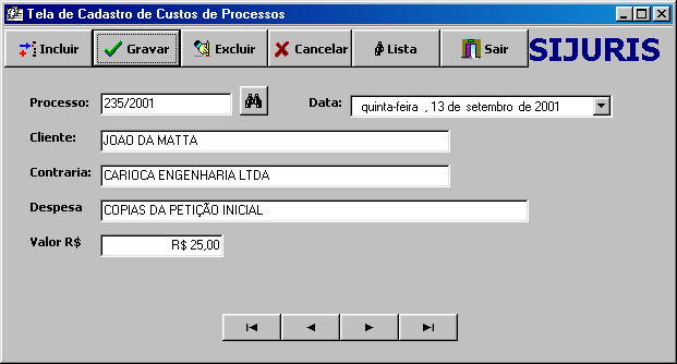Nesta tela você cadastra os custos que tem com o processo, vá cadastrando um a um, que a qualquer hora, você poderá imprimir todos os custos do processo. No relatório saiem o processo, cliente, parte contrária, despesa, data e valor. No final do relatório vem o total gasto.