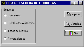 O nono são as etiquetas para várias situações, quando você clicar no botão etiquetas, vai aparecer esta tela lhe pedindo para escolher uma das opções. Importante: as etiquetas tem que ser PIMACO código 6282, que se encontra em qualquer papelaria.