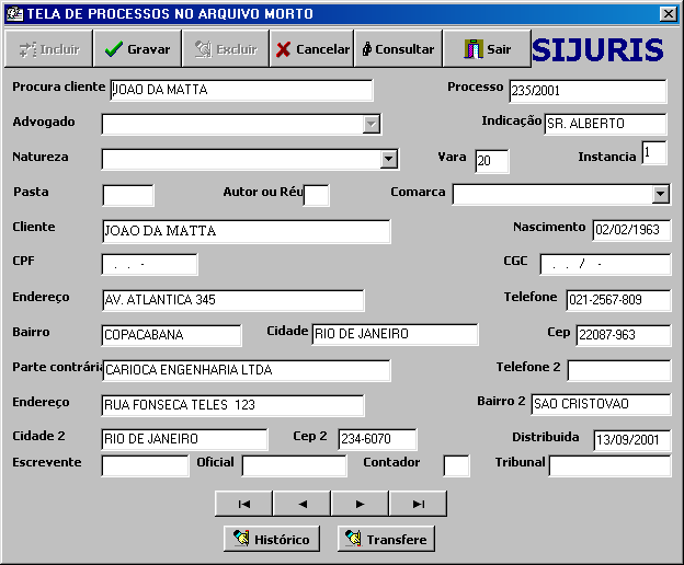 Se você quiser consultar o arquivo morto, então basta clicar no botão Consulta arquivo morto que a tela abaixo se abrirá. Se quiser transferir o processo para o arquivo vivo, basta clicar no botão transfere. O processo voltará com agendas, audiencias, custos e tudo mais.