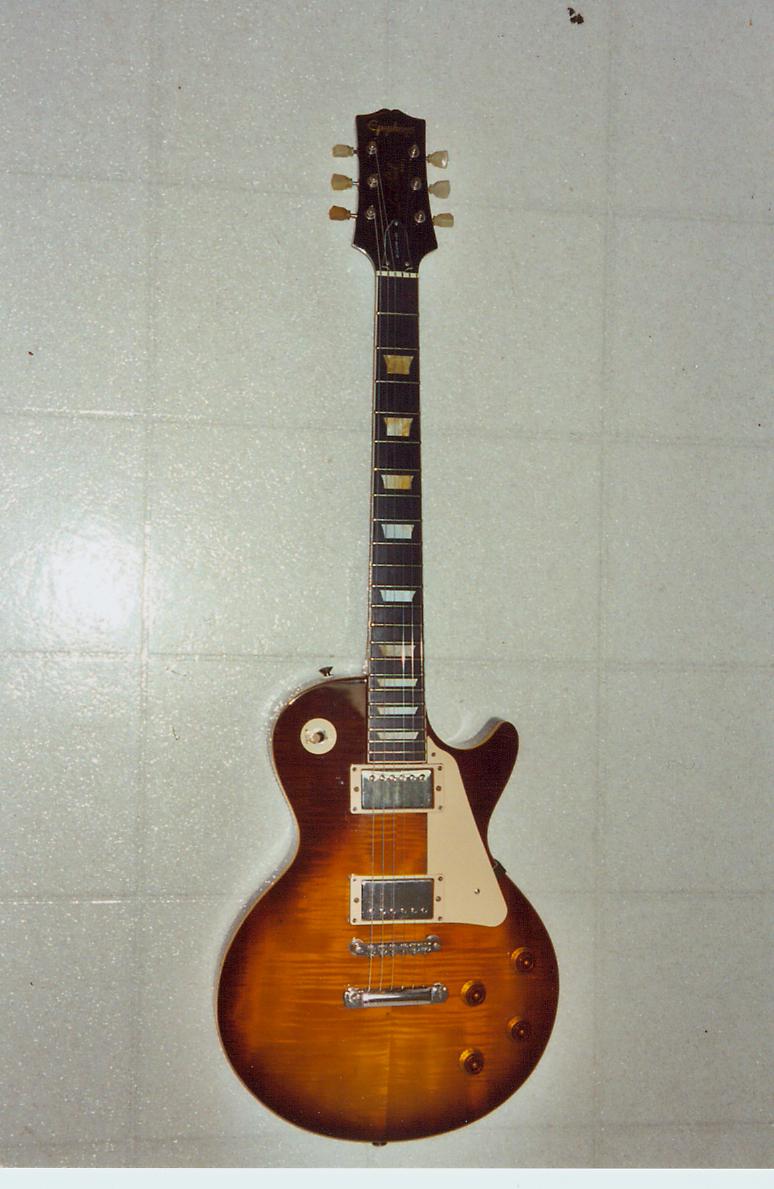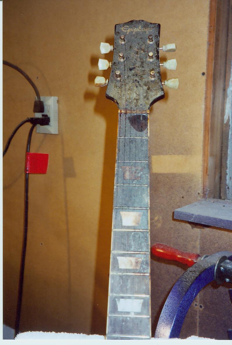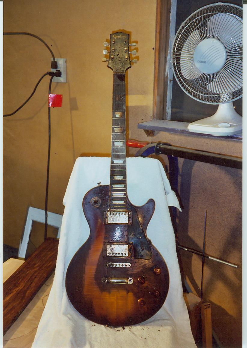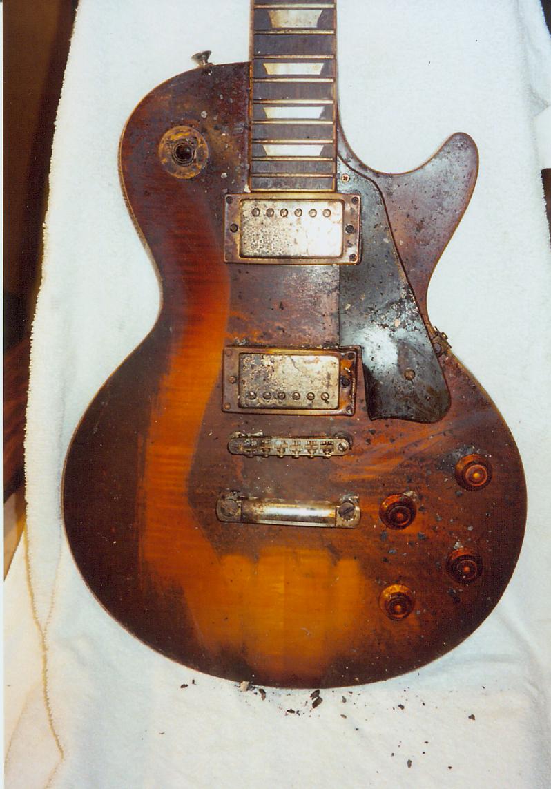 | Fire! This is an Epiphone Les Paul that a customer brought for me to restore after it had been in a fire. According to the owner, it was so bad the case had to be peeled away from the instrument! The plastic parts (pickup rings, switch plate, pickguard) had to be replaced, but the finish needed amazingly little attention, just a little bubbling to fix along the bass edge of the fingerboard. The toughest part was cleaning the gunk off of the metal parts (I went through 3 toothbrushes!). It turned out quite nice, I think. |