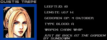 | Quistis werd een SeeD kadet op haar vijftiende en is nu op de leeftijd van 18 jaar een SeeD instructrice. Quistis is erg populair in Balamb Garden. Er zijn zelfs een paar bewonderaars van Quistis die een fanclub hebben opgericht. "De Trepies" (Je kunt de Trepies vinden in het cafetaria van Balamb garden en in het klaslokaal op de tweede verdieping) | ||||||||||||||||||||||