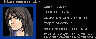 | Als leidster van de verzetsgroep "the Forest Owls" vecht Rinoa tegen de president van Galbadia. Ze is een emotioneel persoon die vaak doet wat haar hart haar ingeeft. Rinoa heeft een hond "Angelo" die vaak te hulp schiet als ze problemen heeft. Haar wapen is een constructie op haar arm waarmee ze projectielen kan afschieten. | ||||||||||||||||||||||