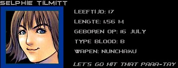 | Selphie groeide op in Trabia Garden en werd onlangs overgeplaatst naar Balamb Garden. Selphie is een echt feestbeest en zij is dan ook voorzitter van het "Garden Festival Comittee". In een gevecht vecht selphie met een "Nunchaku" maar als ze echt in de problemen komt kan ze speciale magie gebruiken tegen haar tegenstander. Sommige mensen zeggen dat Selphie de allerbeste Limit Break van het spel heeft en daar zouden ze wel eens gelijk in kunnen hebben want een van haar spells "The End" schakelt je tegenstander onmiddelijk uit Inclusief Bazen!! (meer hierover in de limit break sectie) | ||||||||||||||||||||||