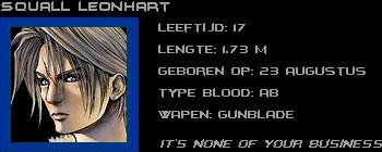 | Squall is de hoofdpersoon van Final Fantasy VIII. Hij wordt door anderen gezien als een stil en koud persoon, maar dat maakt hem niets uit. Zijn wapen, de "Gunblade" is een soort zwaard met een pistoolhandvat eraan. Omdat het erg moeilijk is een gunblade goed onder de knie te krijgen is Squall samen met zijn aartsrivaal Seifer de enige gunbladegebruiker van Balamb Garden. | ||||||||||||||||||||||
