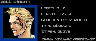 | Met zijn super goede gevechtstechnieken is Zell het enige speelbare personage in Final Fantasy VIII dat geen wapens gebruikt bij een gevecht, maar zijn vuisten. Zell is een heel actief persoon die nooit kan stilzitten maar dat is ook het enige ding dat irritant aan hem is, want Zell is een aardig, slim en positief ingesteld persoon die gek is op hotdogs en bovendien erg goed kan vechten. | ||||||||||||||||||||||