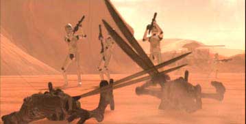 The "Previsualization of Episode II" documentary on the DVD features an animatic of the Clone War which shows a few ideas that did not make it into the final sequence. Mainly, Clones riding speederbikes while tossing detonators onto the Spider Walkers, Clones blasting Geonosians out of the sky and the Corporate Alliance Tank Droids which were not used in the movie.