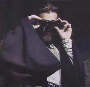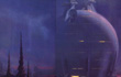 OBI-WAN takes a pair of electronic binoculars from his belt and puts them to his eyes. He sees a cluster of great towers like fantastic stalagmites rise from the plain below.