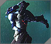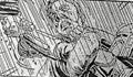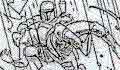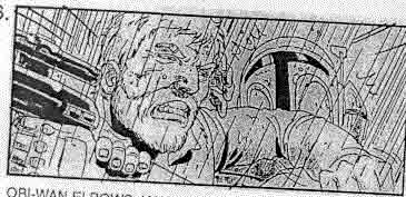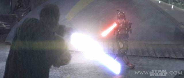 Jango moves in to attack, chopping at Obi-Wan's head, who blocks it. Jango ducks a swing from Obi-Wan and grabs him round the midriff.