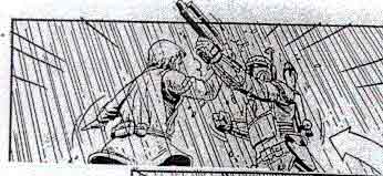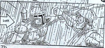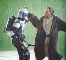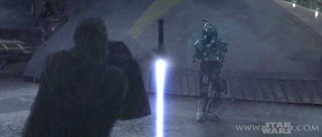 Obi-Wan versus Jango Fett in the rain, my favorite fight in AOTC. Unfortunantly, it too was trimmed down a bit for whatever reasons. Thanks to the leaked storyboards and the Making of Episode II Documentaries, the stunts that were cut are described below.