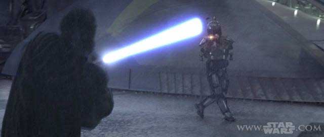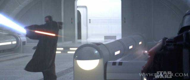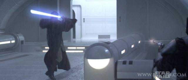 Obi-Wan blocking more shots as he approaches Jango. (A portion of this footage can be seen in the Clone War Trailer.) This is the one cut which I find a bit odd. With this part missing it seems as if Obi-Wan teleports from the landing pad doorway to standing near Jango. Curious. At least we know this sequence had completed FX.