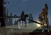 The body of a dead Wookiee (TARFUL) is lying across the stern of the wreckage of the flying boat. There is some movement on the boat. The CLONE SERGEANT on the AT-ST fires a warning shot past the boat.