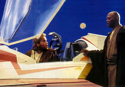 Obi-Wan's Starfighter is ready for takeoff. OBI-WAN and MACE WINDU stand beside it.